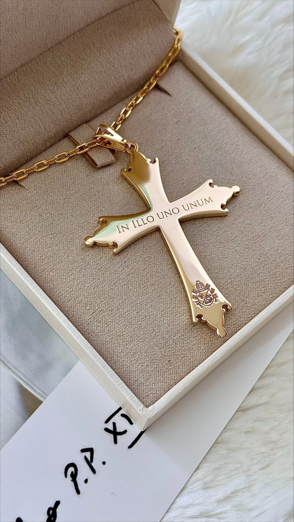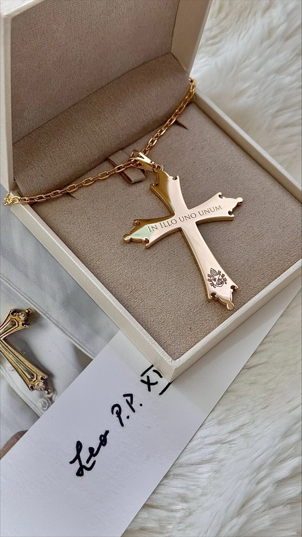 Inspirada na cruz usada por Sua Santidade o Papa Leão XIV, esta peça une nobreza, simbolismo e acabamento refinado, tornando-se uma verdadeira joia sacra.